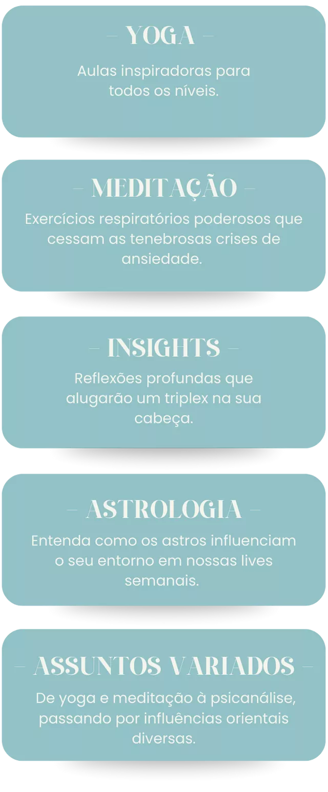 Este curso combina yoga, meditação, exercícios respiratórios, aulas teóricas sobre diferentes abordagens do autoconhecimento como psicanálise, astrologia, etc. Ele foi projetado para promover um equilíbrio entre corpo, mente, emocional e espírito, te ajudando a encontrar mais clareza e serenidade em sua vida cotidiana.